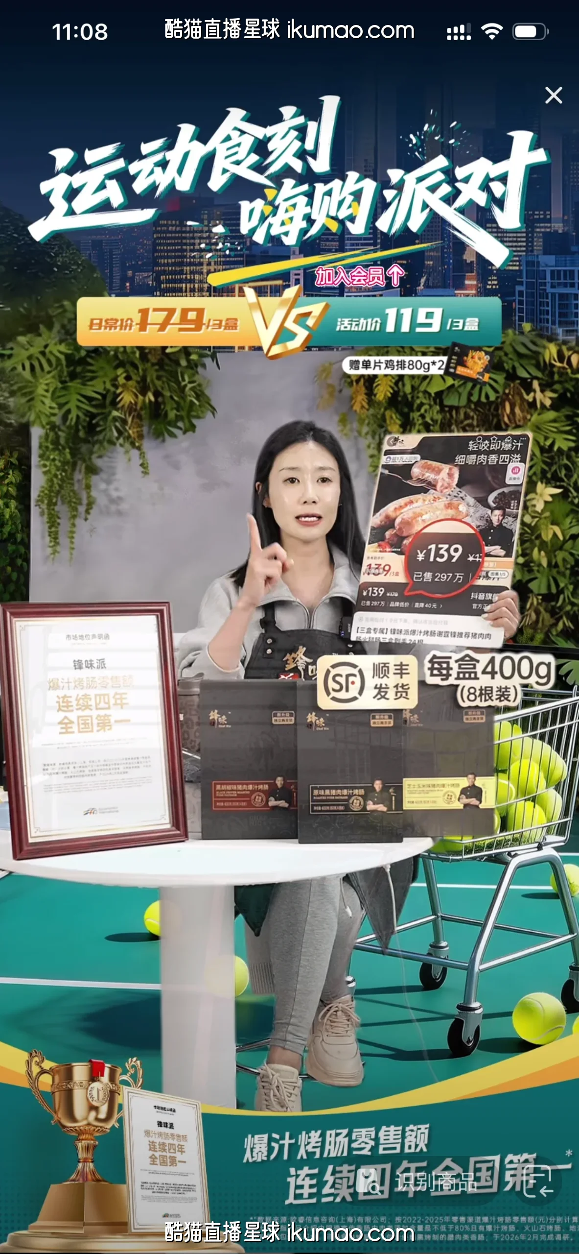 🎾 这张烤肠直播间的图第一眼就戳中我,运动场地的设计太有记忆点了,网球、购物车里的网球和奖杯都把烤肠和运动关联起来,视觉上很新鲜。