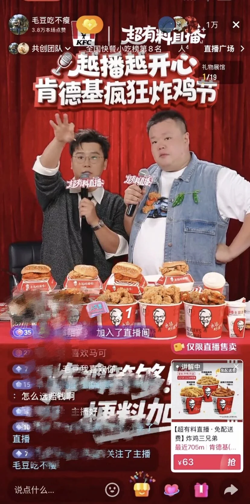 主持人马可和脱口秀演员毛豆直接把脱口秀演出搬进了直播间,两日连播的过程中,通过原创肯德基炸鸡三兄弟卖点歌曲+持续爆梗,观众在一个接一个的有趣笑料中自然进入了这个「带货场+内容场」。