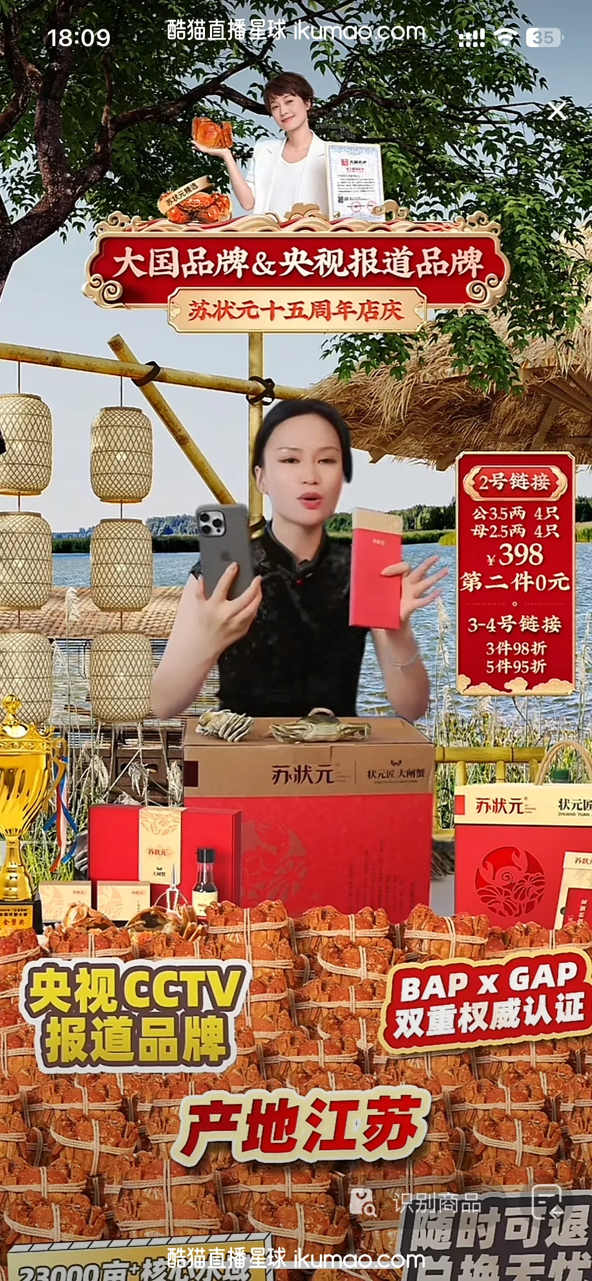 🏮 见过不少生鲜直播间要么太土要么太花,这张刚好平衡了传统和现代,没有过度装饰,反而用证书、奖牌增加信任感,不像某些直播间只靠主播喊话。
