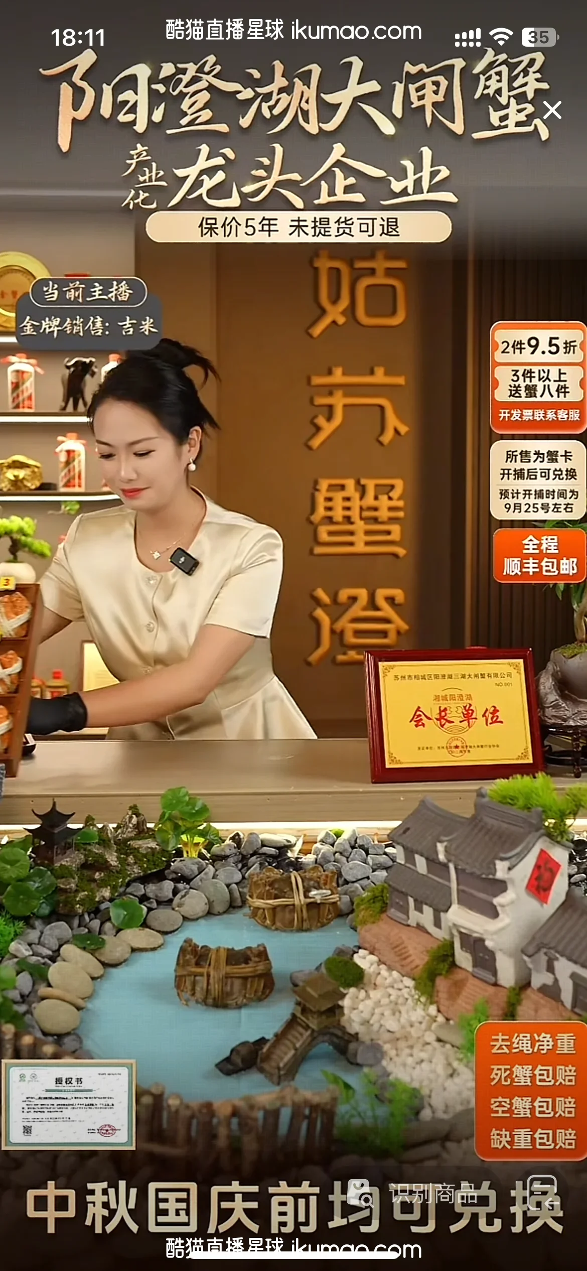 🏮 这张图最打动我的是国潮风格的背景,‘姑苏蟹港’的金色字体和木质墙面,加上桌上的江南水乡模型,把阳澄湖的地域特色做活了,比普通海鲜直播间有记忆点。