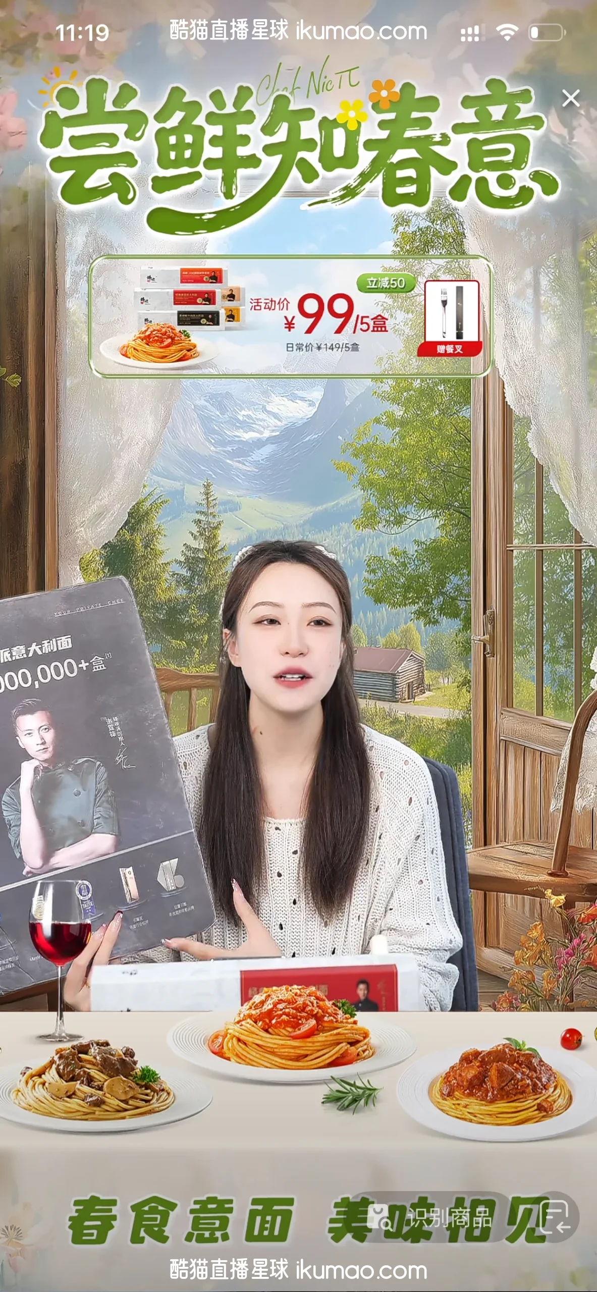 这张直播图以春日自然景观为背景,融合意面产品展示与促销信息,整体风格温馨清新,通过场景化设计强化产品质感,适合餐饮行业尤其是意面、西餐类直播场景