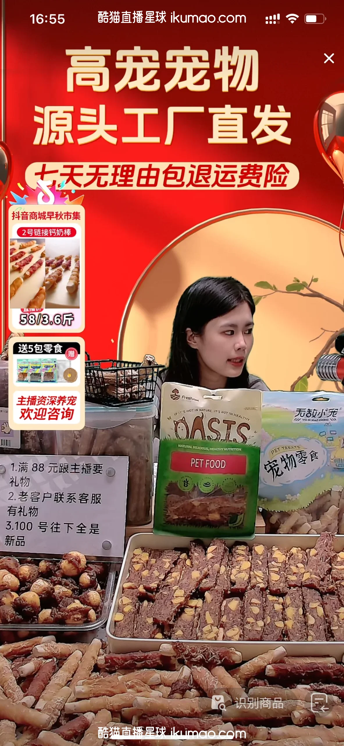 🫀 第一眼就被这大红色背景给吸引住了,宠物零食堆得满满当当,主播站在中间,整个画面像把热闹的市集搬进了直播间,看着就很有购买欲。