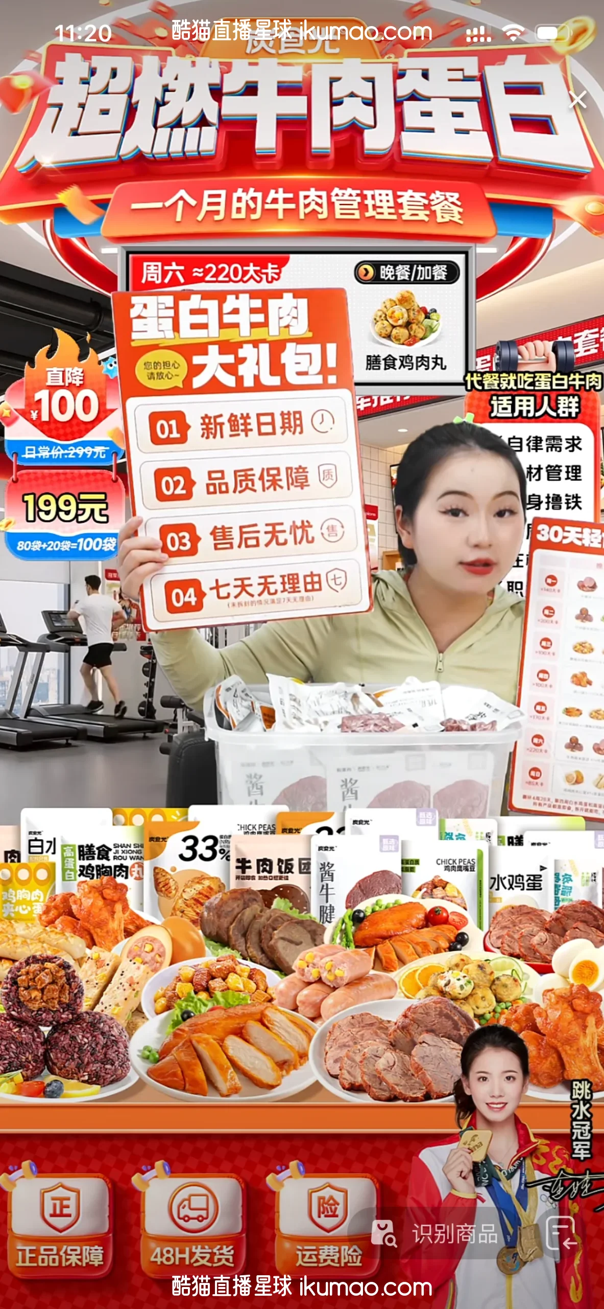 🔥 这种风格肯定能吸引健身党,因为背景是健身房,产品是牛肉蛋白,促销信息明确,还有七天无理由,让人觉得靠谱,不像有些直播间光喊口号,这个真的有细节。