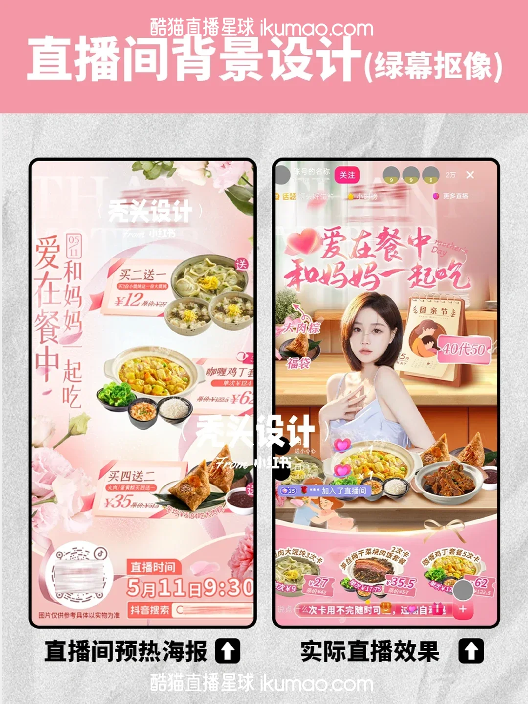 🍬 这种设计其实很聪明,用粉色系营造母亲节的温馨感,美食展示让用户有代入感,绿幕抠像又让场景更灵活,既好看又不影响带货,难怪看起来舒服。