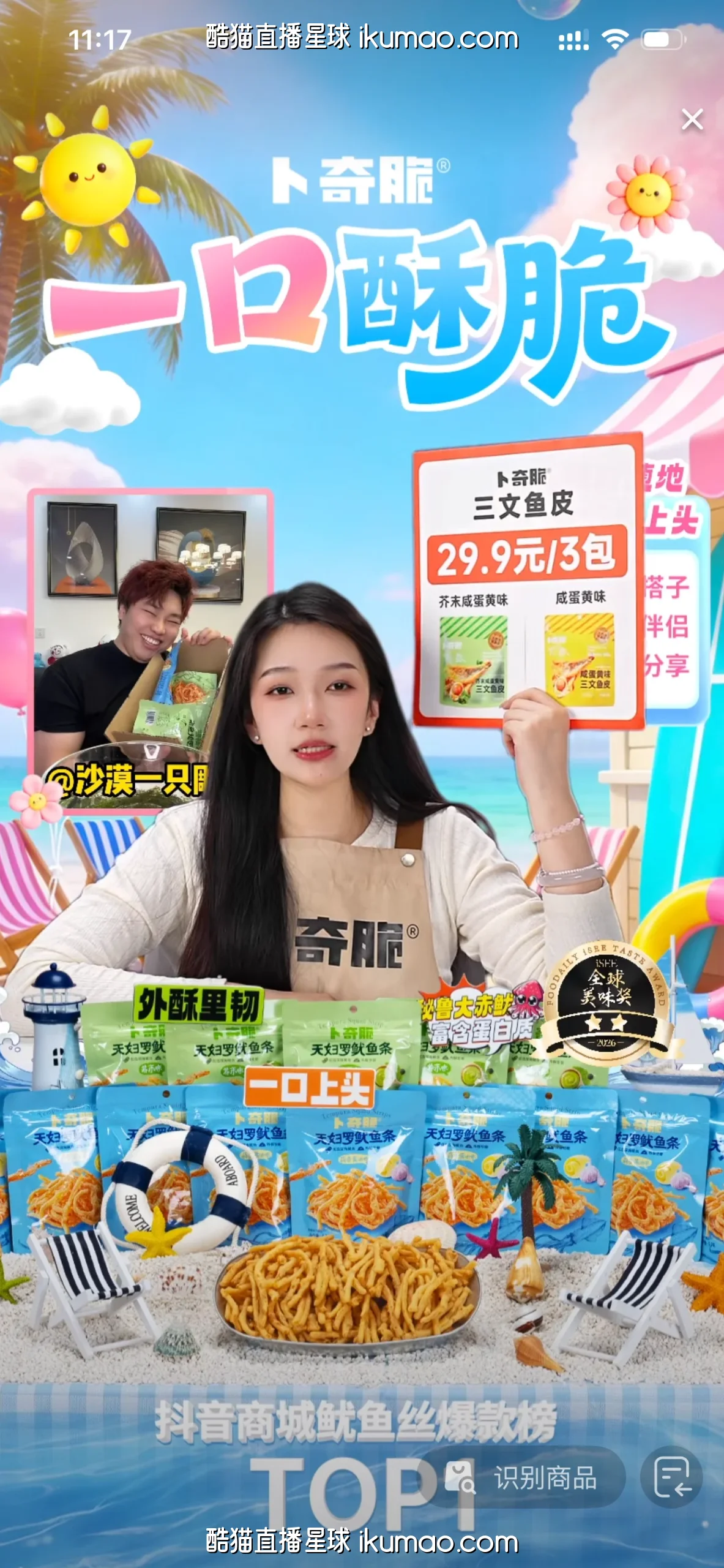 🍬 这样安排是因为海滩场景能降低零食的厚重感,蓝粉配色吸引年轻用户,信息层级清晰,适合零食带货直播,尤其是抖音商城爆款榜的场景,让产品更显眼,更容易促成转化。