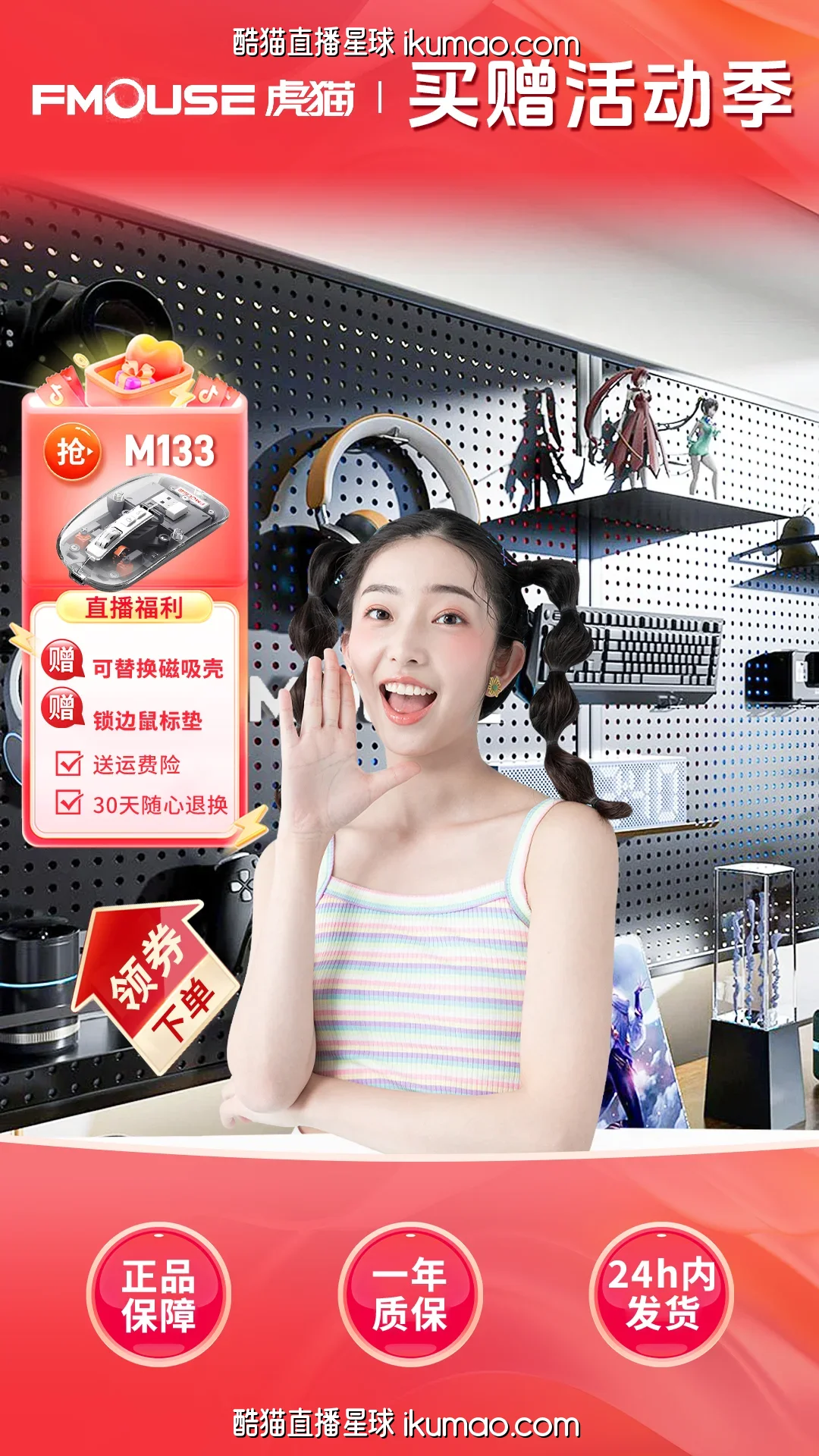🍎 配色上用了高饱和度的正红色作为主基调来制造促销紧迫感,搭配白色文字确保远距离可读性,亮黄色只用在'抢'、'赠'这类行动按钮上做视觉锚点。排版采用了经典的左卡右人带货布局,左侧信息卡片做了三层递进结构:顶部放产品型号M133和透明壳卖点吸引注意力,中间区域集中展示磁吸壳、鼠标垫等赠品清单建立价值感,底部用运费险和退换政策打消顾虑;右侧主播安排在画面右侧黄金分割位,挥手的手势自然引导视线流向左侧产品区。