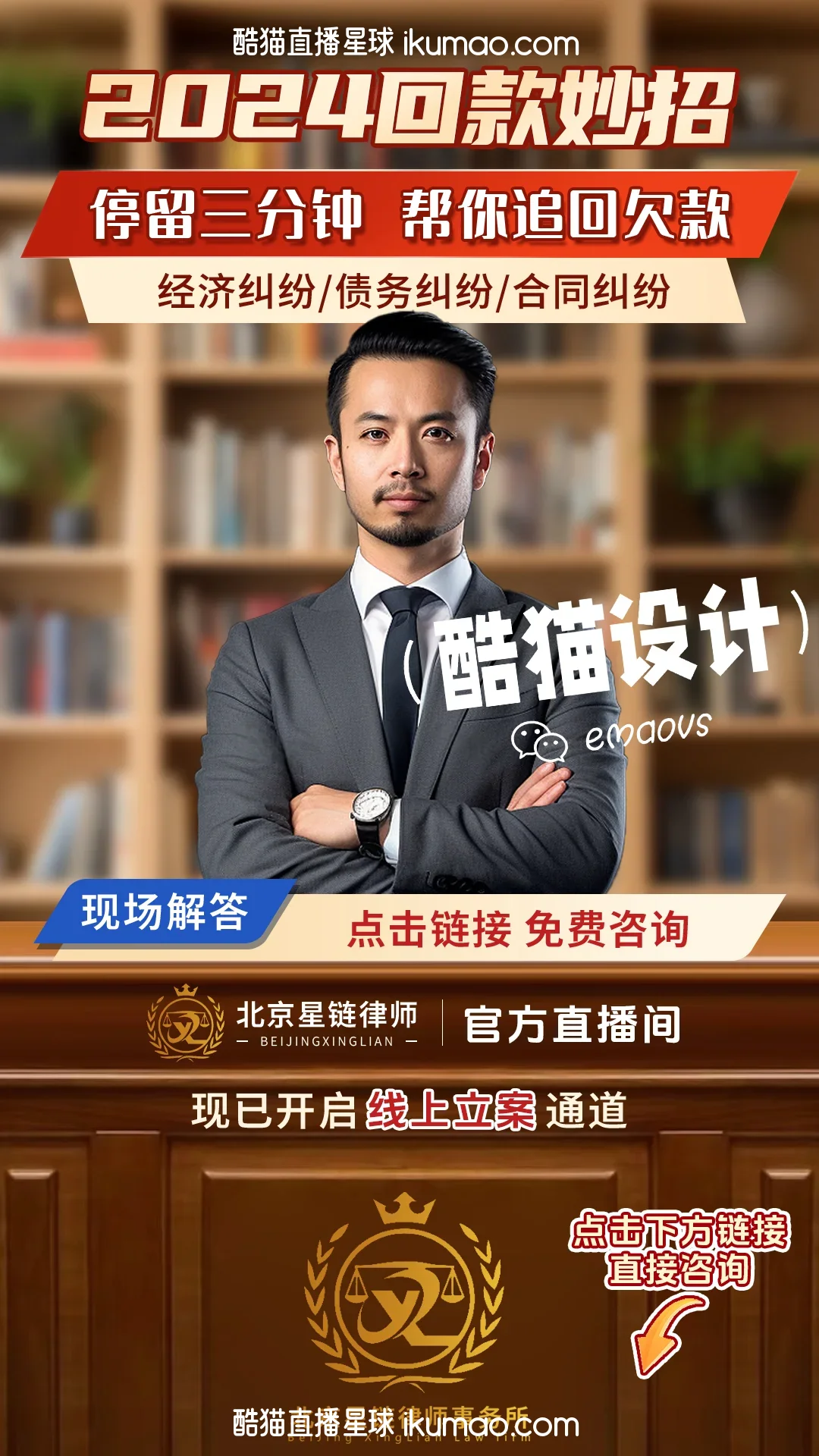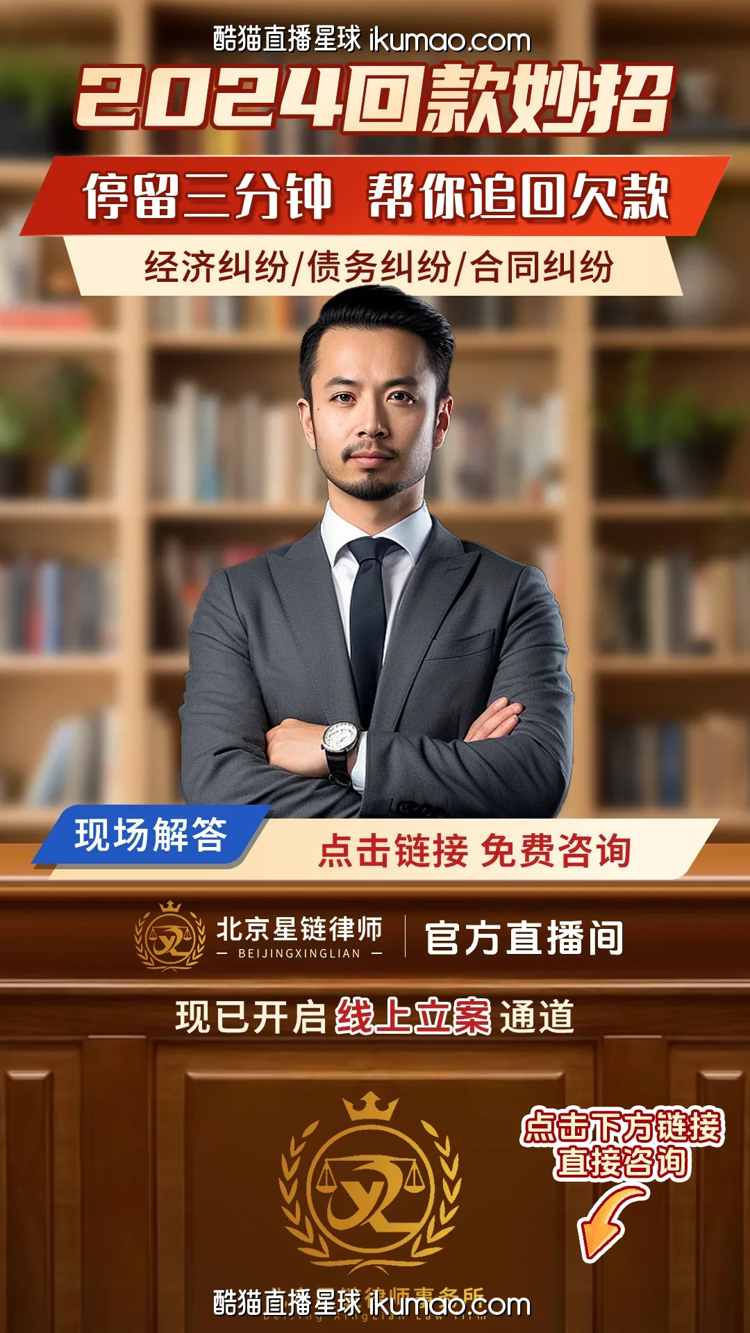 🪽 这图第一眼就让人觉得“稳”,像走进律所接待室,书架背景堆着书,主播穿西装打领带,双臂交叉站在中间,整个画面透着股“靠谱”的感觉,不像有些直播间那么花哨,反而让人觉得“这事儿能放心交给他”。