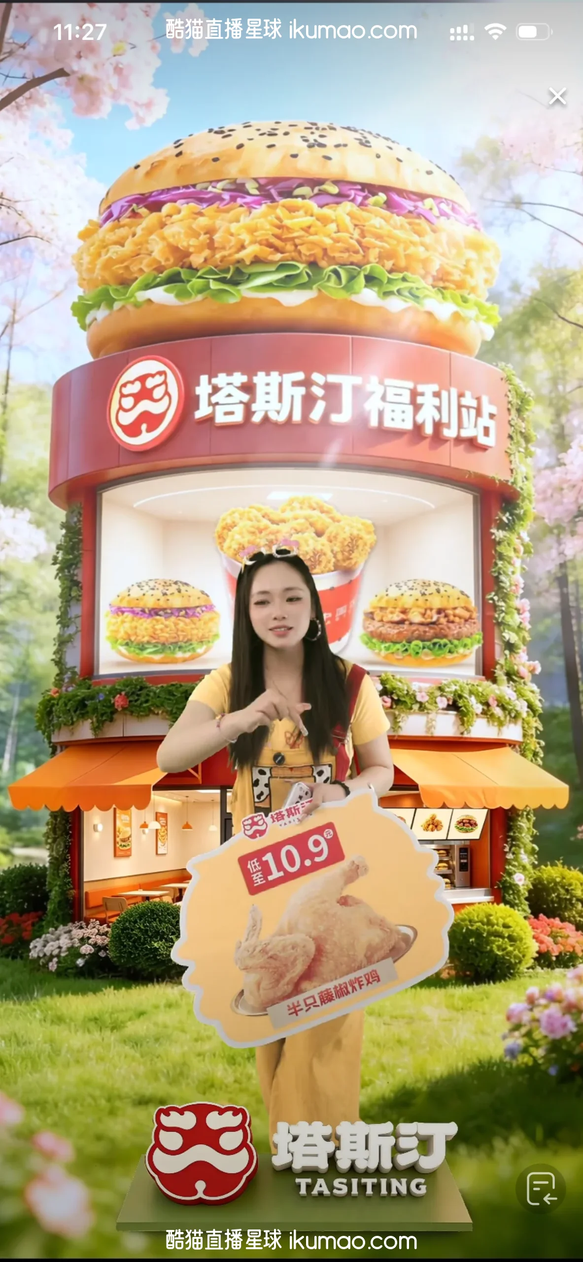 🥢 整体是暖橙色的塔斯汀门店,加上黄色的主播衣服,颜色搭配得很舒服,不会太刺眼,而且背景的汉堡和炸鸡是立体的,比平面的海报更有代入感,像真的在福利站门口一样。