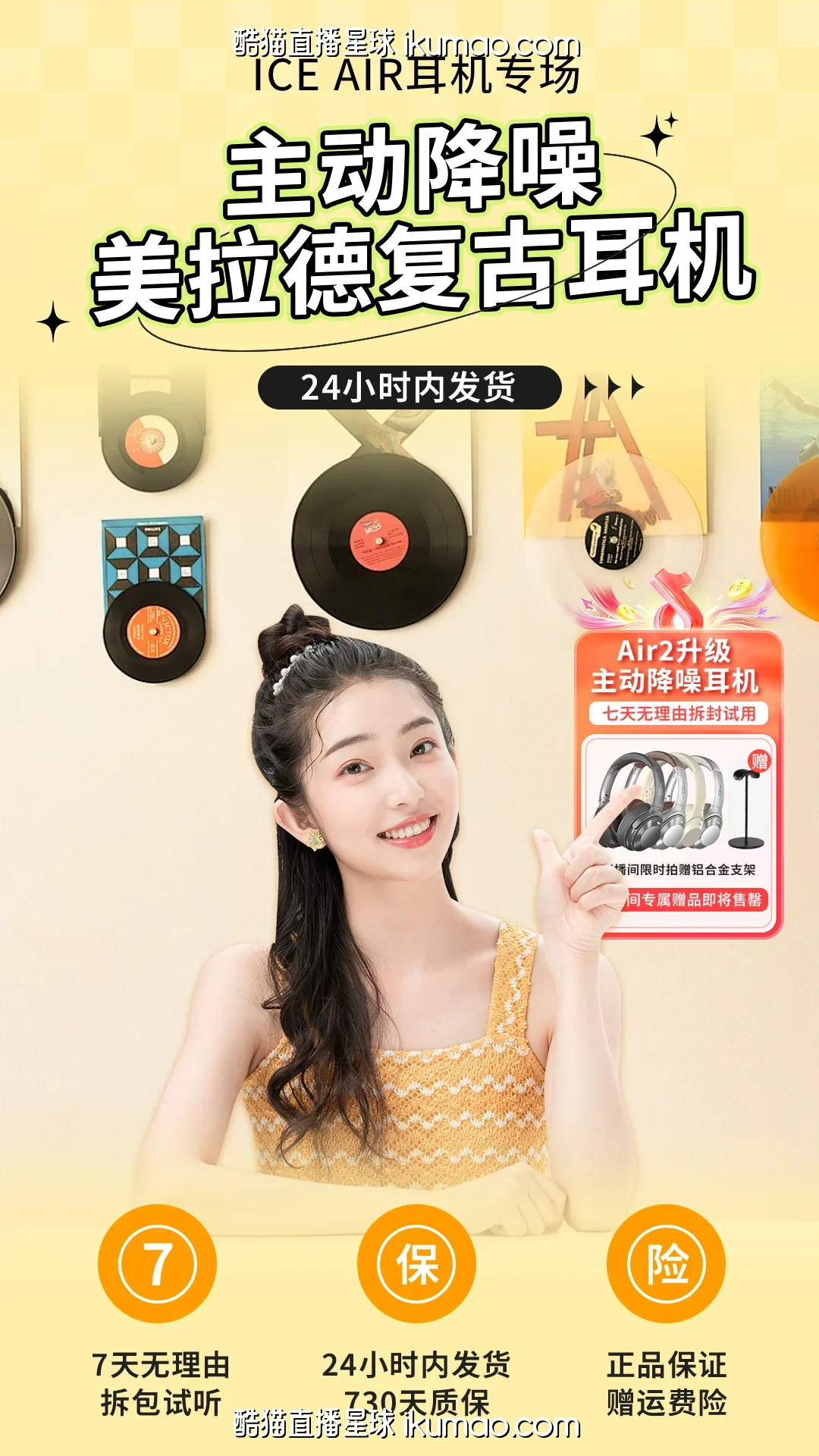 🪭 我这样设计是因为复古耳机目标用户喜欢有质感的视觉,黄色系既符合复古调性,又比常见的黑灰更有活力,适合带货直播需要的高点击率;24小时发货和7天试听的保障信息放在底部,用橙色按钮突出,让用户快速get售后优势。