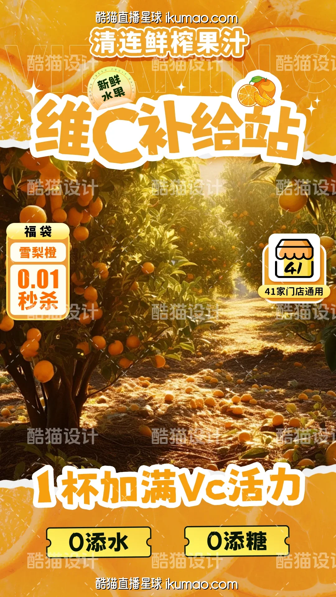 🍹 橙色调铺满背景的果园场景,文字区块和产品信息用白色和黄色点缀,既保持画面统一,又让信息清晰可见,避免视觉混乱