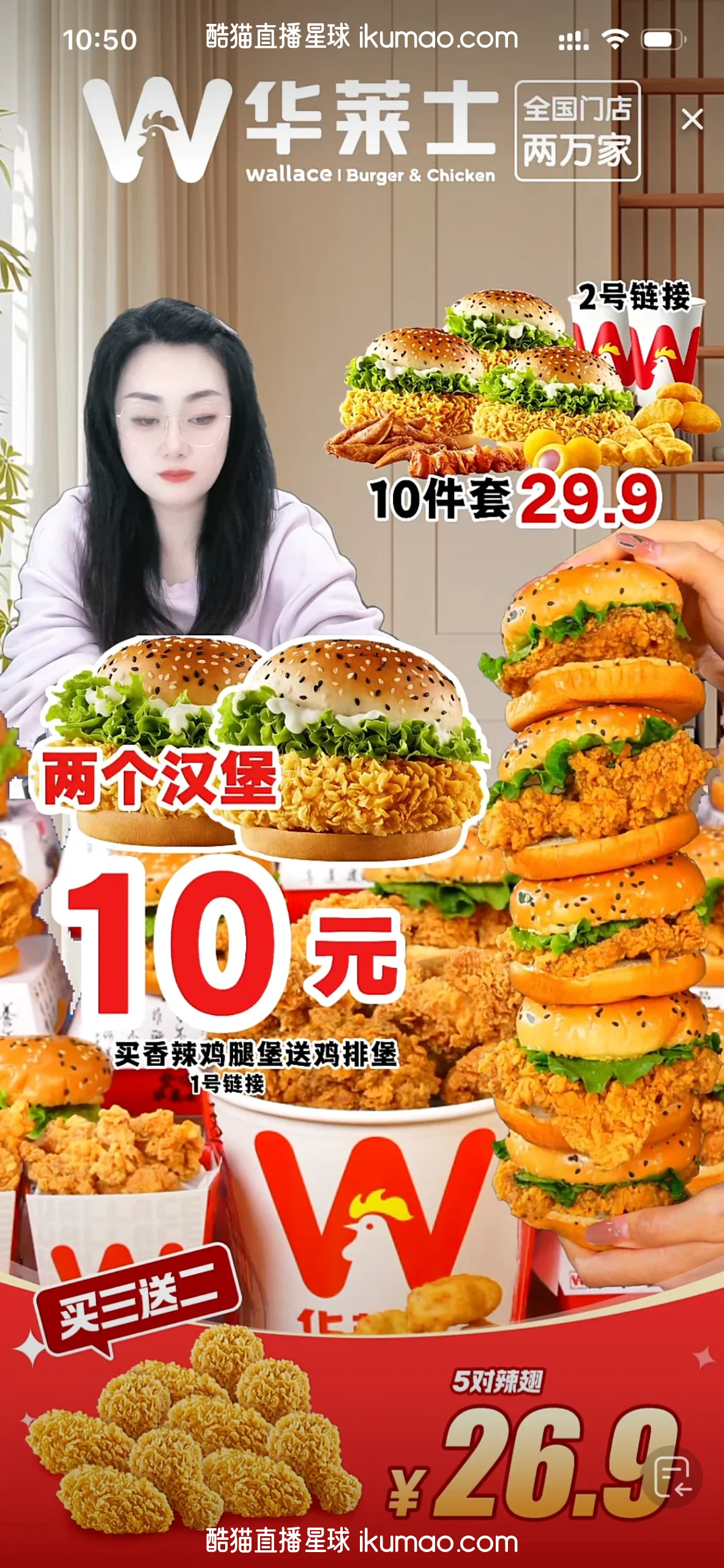 "description": "华莱士直播间通过红色背景搭配堆满的炸鸡汉堡,突出29.9元10件套等优惠,产品摆放有量感,吸引食欲,适合餐饮带货",