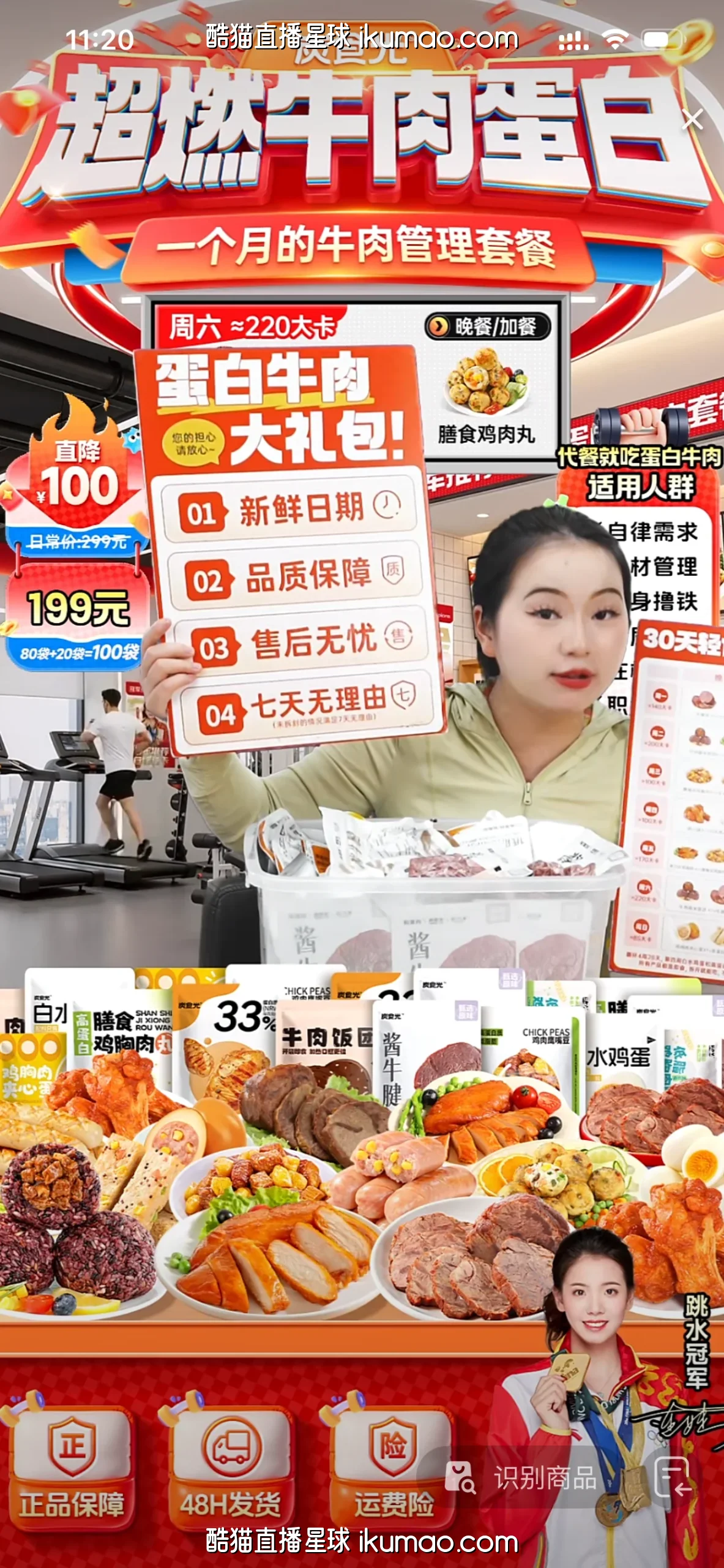 🔴 我想让观众第一眼就看到‘直降100’和‘蛋白牛肉大礼包’,因为促销是直播间转化的关键,而‘大礼包’能引发‘占便宜’的心理,这样用户才会继续看下去。