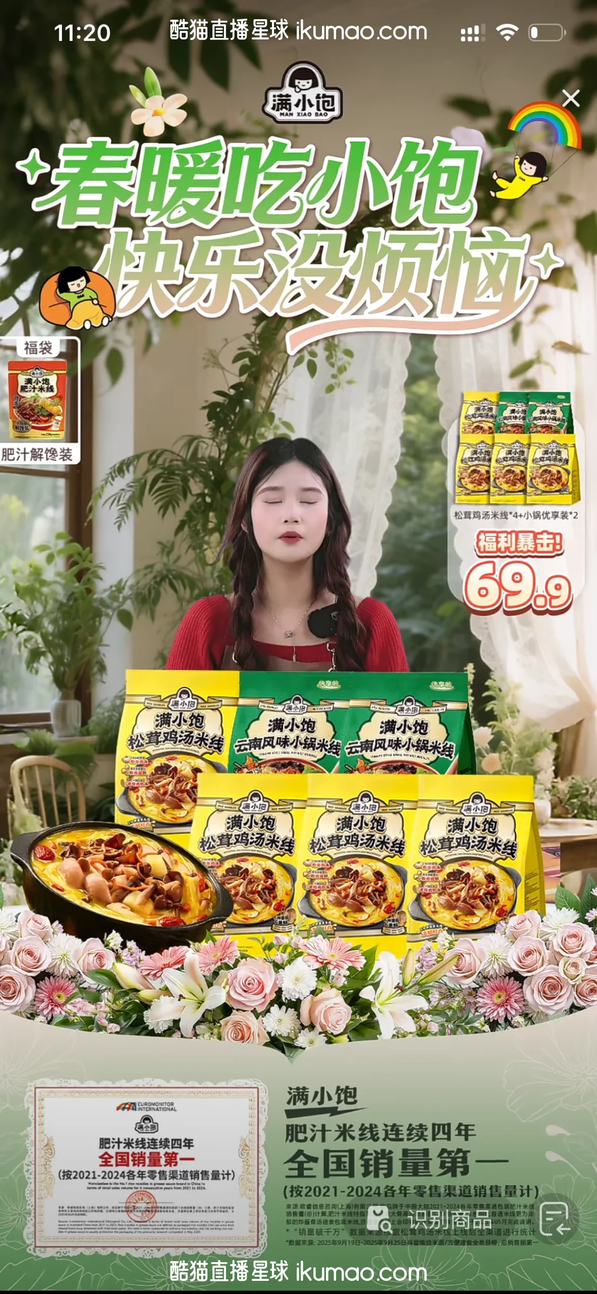 仔细看才发现,主播前面的产品堆得像小山,还有锅里的米线冒着热气,旁边还有‘连续四年全国销量第一’的证书,细节做得很到位,不是那种乱堆的,而是有层次感的摆放。