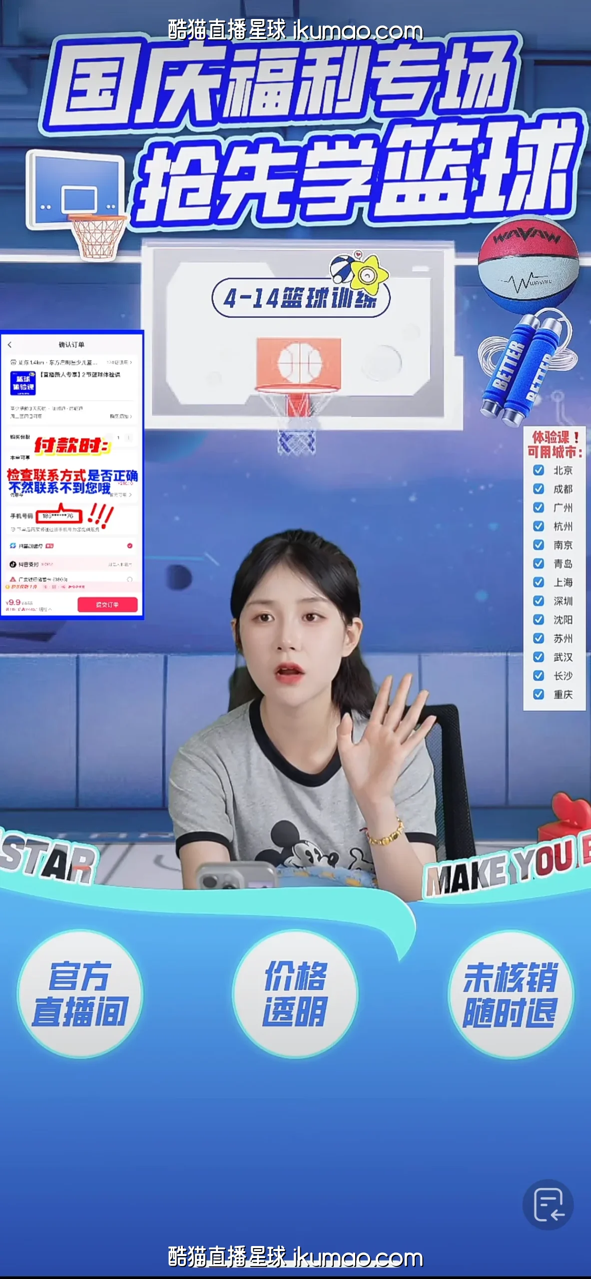 💙 我重点平衡了视觉冲击和信息传达,把‘国庆福利专场’的大标题放在最上方,用白色粗体突出,下面是篮球训练的图标和‘4-14篮球训练’的副标题,再放订单确认框和可用城市列表,既强调福利,又清晰展示产品信息,避免信息过载。